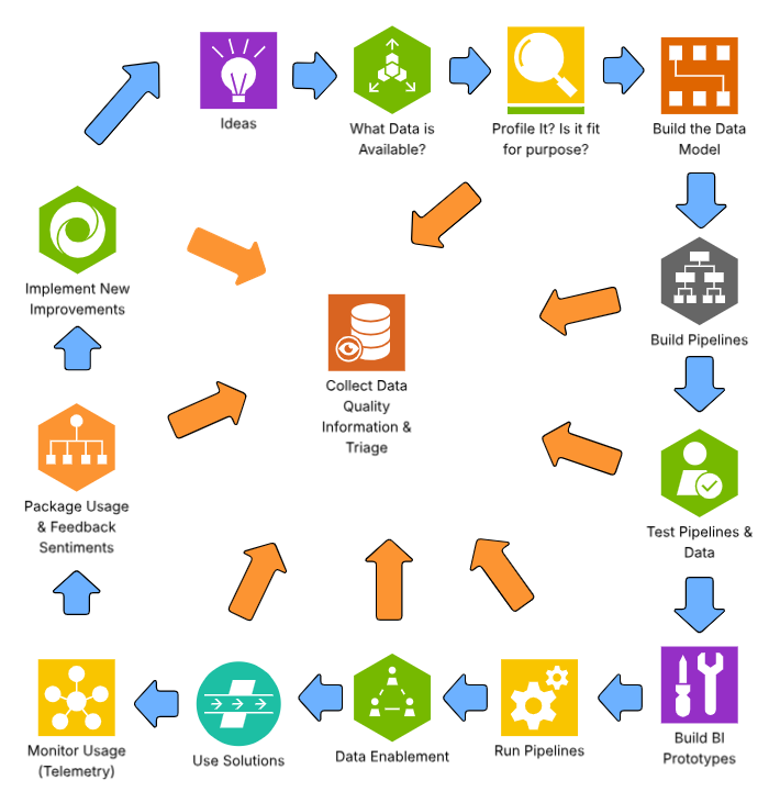 The build process overall will follow this methodology, the steps are: (1) Ideation; (2) Determine what data is available; (3) Data profiling; (4) Building data models; (5) Building data pipelines; (6) Testing data pipelines and resulting data; (6) Testing full process; (7) Building AI, BI, and Digital Transformation prototypes; (8) Production run pipelines — this feeds into data enablement and use of the new data capabilities.