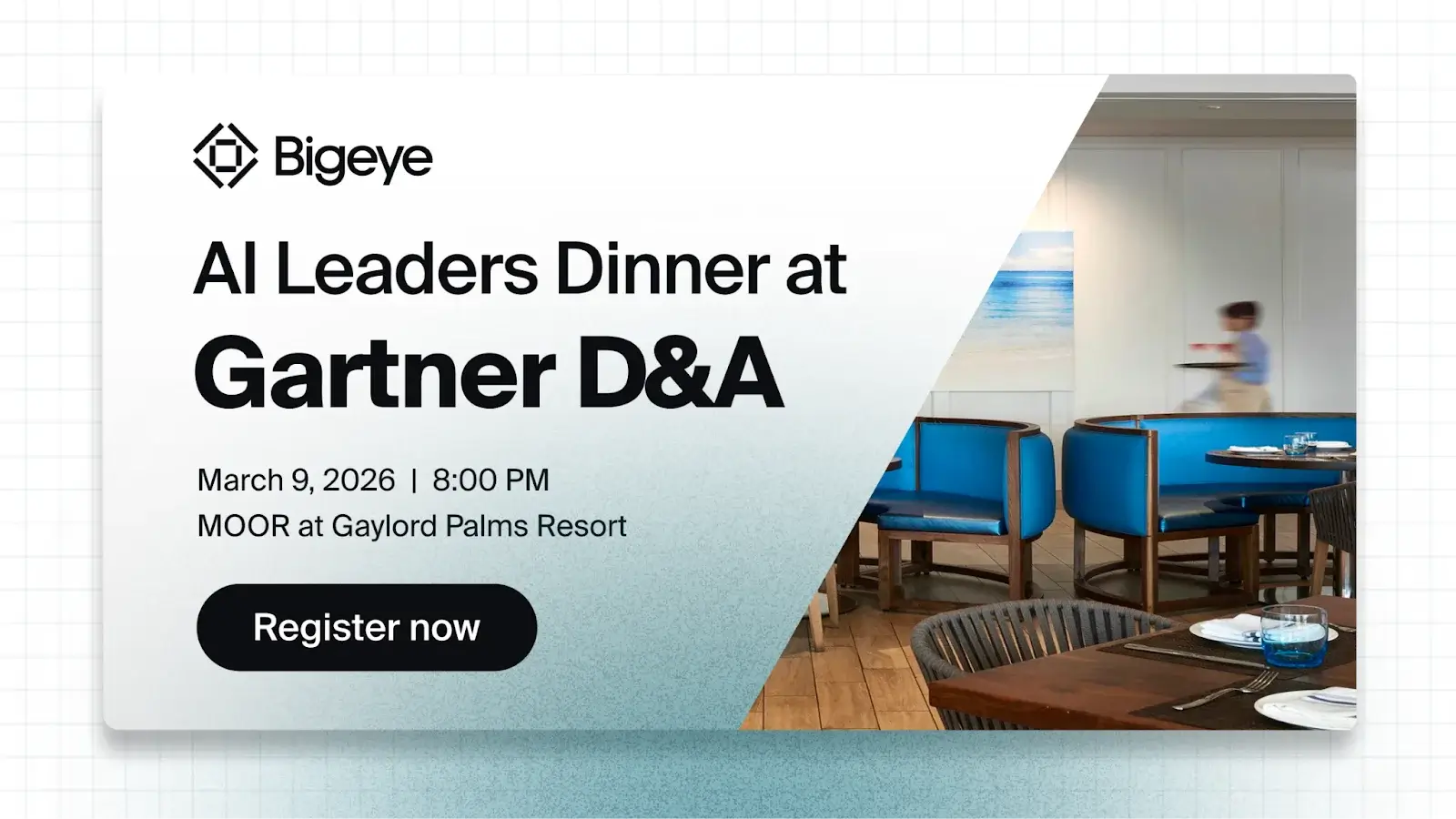 Join Bigeye for a private evening of modern dining and conversation with enterprise data and AI leaders, hosted on property at the Gaylord Palms Resort following the first day of the Gartner Data & Analytics Summit.