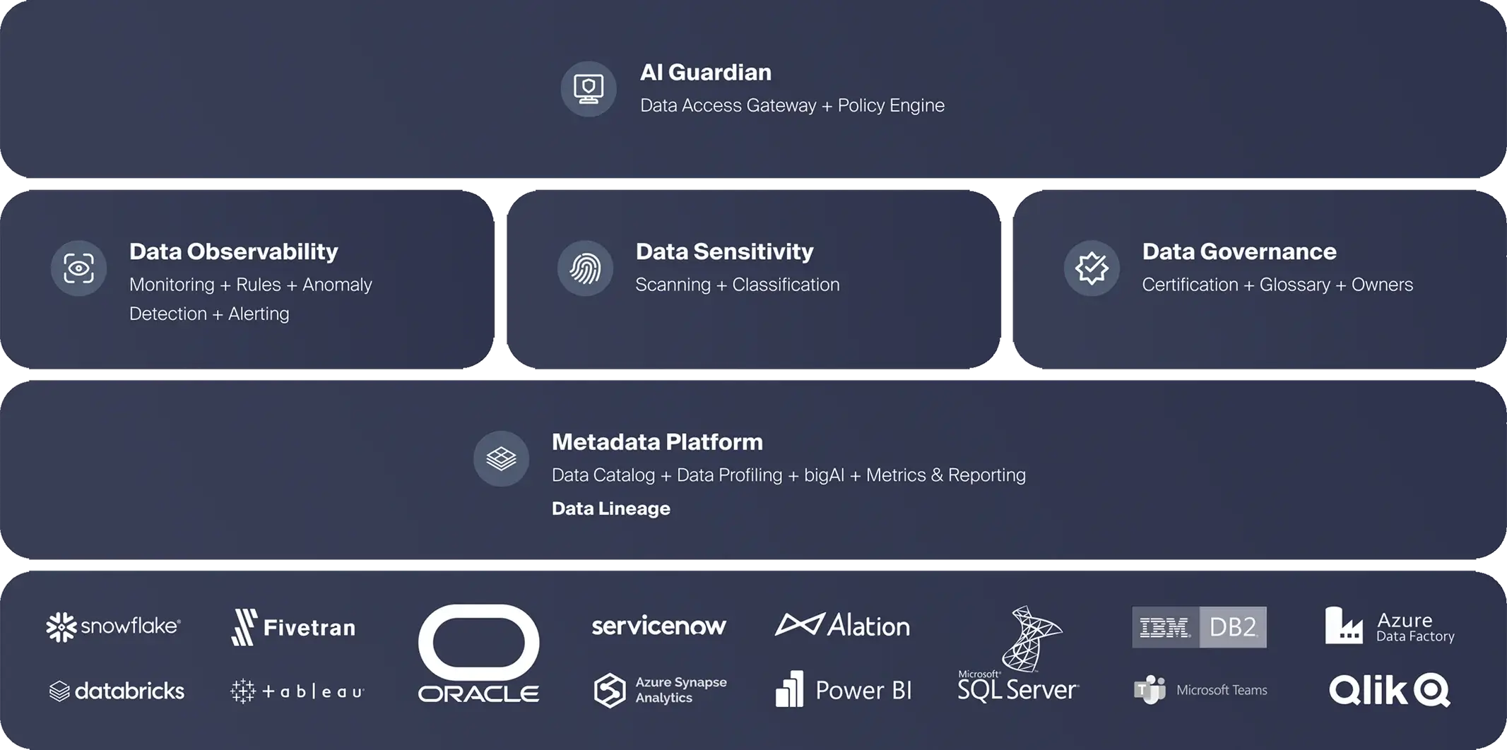 The Bigeye AI Trust platform consists of multiple modules that allow you to customize the platform to best meet your enterprise data and AI use cases. Monitor your data pipelines, manage data sensitivity and governance, and apply runtime enforcement to your AI policies — all from one integrated platform!